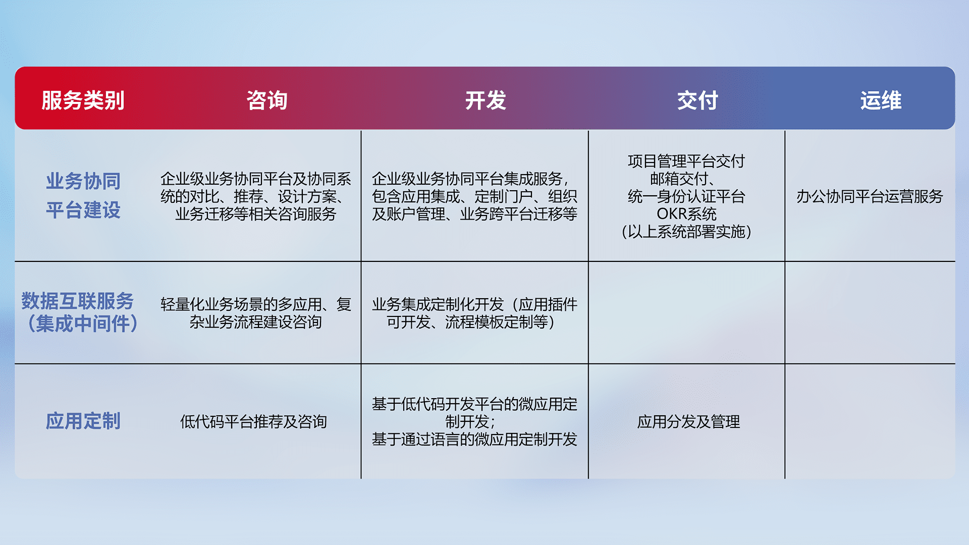 针对钉钉、、、、企微、、、IDaas等平台级产品提供产品的规划、、、方案、、交付、、、定制化开发等服务,,实现如统一协同办公、、、、智能客户服务、、、、混合会议管理、、、、智能数据查询、、、、等业务场景,,,,实现数字化转型。。。